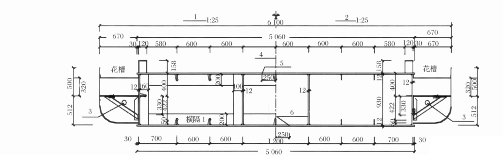 2支座斷面﹔2-1/2跨中斷面﹔3-中80PVC 排水管﹔4-結(jié)構(gòu)中心線﹔5-頂板現(xiàn)場(chǎng)拼接線﹔6-底板現(xiàn)場(chǎng)拼接線圖1 主橋箱梁典型橫斷面示意