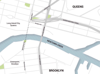 當(dāng)你站在布魯克林綠點(diǎn)附近的曼哈頓公園大道上時(shí),你會(huì)看到長島天際線和一條小河(Newtown Creek)。
